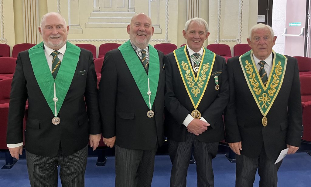 From the left: W Bros Mal Sharpless, our acting District Grand Secretary, Stephen Sharp DistGDC, Clive Copley PGStdB DepDistGPref and Barry Massam PGJD.